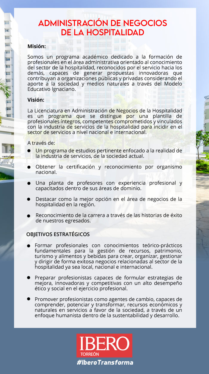 - Fundamentos de administración y contabilidad además de un sentido operativo práctico para poder intervenir en las distintas actividades del sector hospitalario. Podrá intervenir en cualquiera de las actividades que se deriven de lo anterior para resolver oportunidades o la generación de ellas, logrando un nuevo modelo de logística que resulte en empresas de la hospitalidad más competitivas con un valor agregado en su capital humano y de conocimiento.