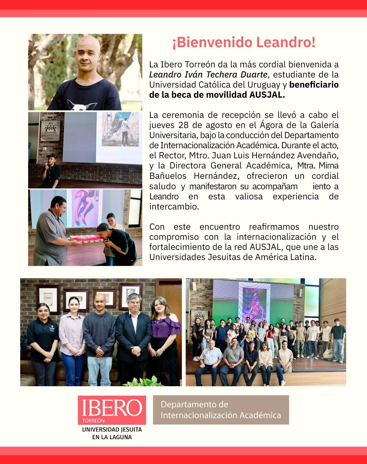 En la Ibero Torreón creemos que los intercambios académicos son una oportunidad invaluable para ampliar horizontes, fortalecer la formación profesional y enriquecer la experiencia personal de nuestros estudiantes. Participar en programas de movilidad nacional e internacional les permite vivir otras realidades educativas y culturales, generando aprendizajes que trascienden el aula y que contribuyen a su desarrollo como ciudadanos globales, comprometidos con la justicia social y con una visión más amplia del mundo.